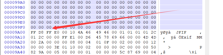 用WinHex打开,可以看到在00009A00处有jpg的文件头,将前面的数据删除。