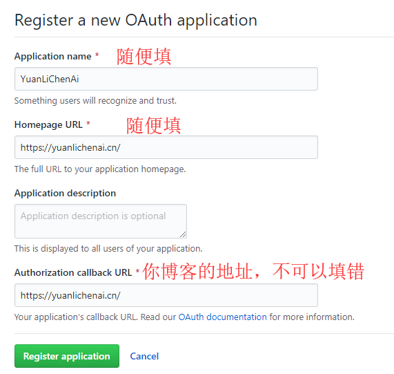 首先创建一个OAuth application应用,地址https://github.com/settings/applications/new